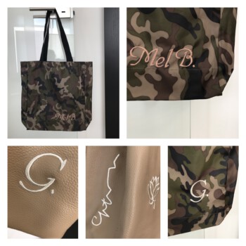 In verschiedenen Schriften & bis zu 500 Garn-Farben von nachtleuchtend, bis Neon oder Silber, Kupfer oder Metallgold kann ich sticken. Alles in edler pflegeleichter Qualität.